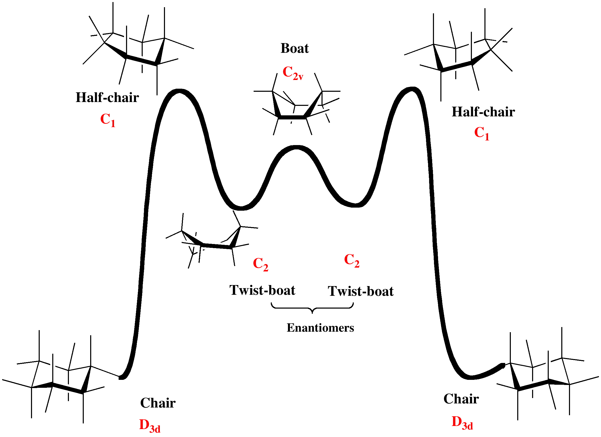 Chirally continuous pathways are indeed intriguing. One deceptively simple system which has some of these features is in fact the axial/equatorial substituent flipping of cyclohexane. On Bob Hanson’s page, you will find one possible potential energy pathway for it do do this. This shows a symmetrical potential, with a twist boat minimum at the half way stage. This, and the preceding half-chair both have C2 chiral symmetry. Thus in this representation, most of the potential involves a chiral species, and only the start and end chairs are achiral. Another, possibly more common, representation of this ring flip involves a boat transition state (of C2v symmetry) at the half way point. This represents the more conventional mechanism for enantiomerisations, in which the mid point (transition state) has a plane of symmetry which allows reflection of one enantiomer on to the other and hence is not chirally continuous.